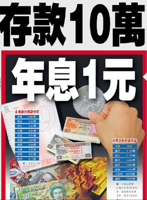 據(jù)香港大公報報道,外圍資金持續(xù)流入,銀行體系嚴重“水浸”,令港元拆息低無可低。匯豐銀行率先下調(diào)港元活期存息,紓緩資金成本壓力,由原來0.01厘,大幅削至0.001厘。換言之,10萬港元存款年息由原來10元,減至僅收息1元。銀行界人士指出,低存息將誘發(fā)資金由銀行體系,流入至資產(chǎn)市場,尋求較高回報,但提醒市民應(yīng)審慎入市。