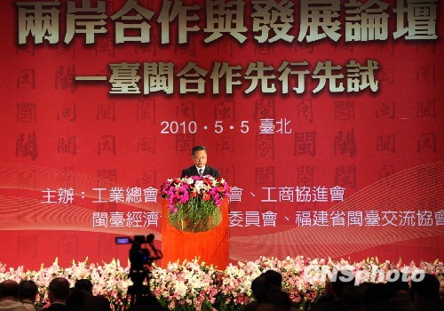 5月5日下午,“兩岸合作與發(fā)展論壇——臺閩合作先行先試”在臺北圓山大飯店舉行,福建省長黃小晶、臺灣海基會董事長江丙坤等人發(fā)表演講。圖為黃小晶在發(fā)表主題演講。 中新社發(fā) 董會峰 攝