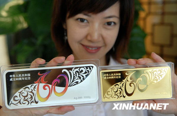 7月14日,工作人員展示新中國成立60周年紀念金銀條鳳舞系列。由中國印鈔造幣總公司制造發(fā)行、中鈔國鼎公司總經銷的中華人民共和國成立60周年紀念金銀條,將于7月23日在北京菜百商場首發(fā)。該套產品分為龍騰系列和鳳舞系列。新華社發(fā)