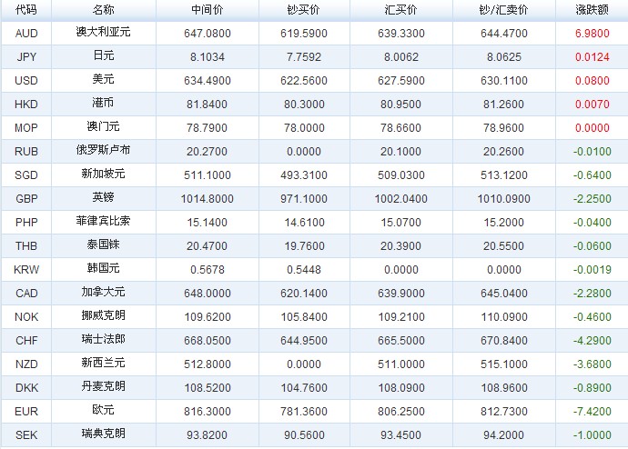 9日人民幣匯率中間價:1美元對人民幣6.34...