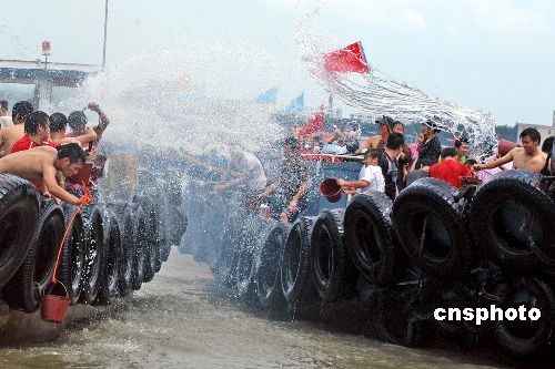 每逢端午節,兩岸對渡的船只都要在蚶江海邊追逐潑水,以這種歡快的方式互祝吉祥,交融情誼,并祈求平安興旺!昂I蠞娝钡牧曀子纱水a生并代代相傳,距今正好二百二十五年。端午節“海上潑水”也成了全球僅有的文化習俗。