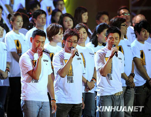 8月17日,在香港舉行的賑災義演中,香港藝人張學友(前左)、譚詠麟(前中)和劉德華(前右)演唱《一點燭光》。當日,香港及海峽兩岸藝人在位于香港的亞洲國際博覽館舉行賑災義演,為受到臺風“莫拉克”影響的臺灣民眾籌款。新華社記者陳鐸攝