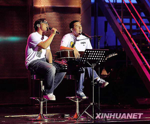 8月17日,在香港舉行的賑災義演中,香港藝人陳奕迅(左)和房祖名演唱《一路走好》。新華社記者陳鐸攝