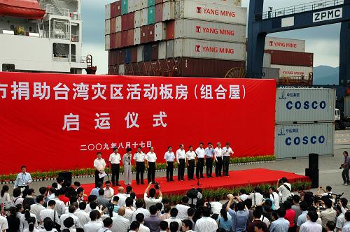 8月17日,深圳捐助臺灣災區物資啟運儀式在深圳鹽田港舉行。當日,深圳捐助給臺灣災區的首批100套活動板房從深圳鹽田港啟運。臺風“莫拉克”使臺灣遭受50年來最嚴重的水災,為幫助受災的臺灣中南部地區,深圳市委、市政府日前決定向臺灣災區捐贈1000套活動板房,總價值近2000萬元。新華社記者 吳俊 攝