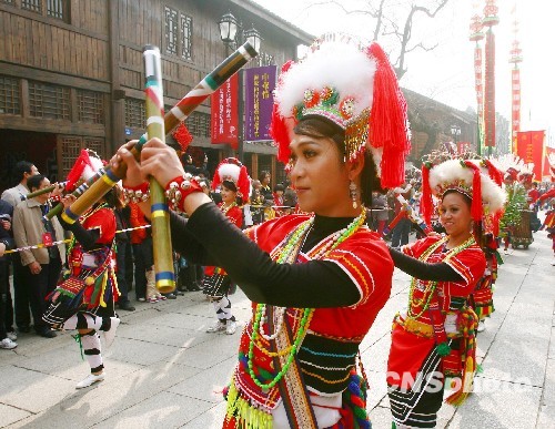 1月31日上午, 由中國文學(xué)藝術(shù)界聯(lián)合會、中國民間文藝家協(xié)會、福建省文學(xué)藝術(shù)界聯(lián)合會主辦的“中華情——海峽兩岸民間藝術(shù)嘉年華活動”在福州三坊七巷開幕,兩岸民間表演隊伍聯(lián)合進行踩街表演是其中的一項活動。 中新社發(fā) 祝敏松 攝