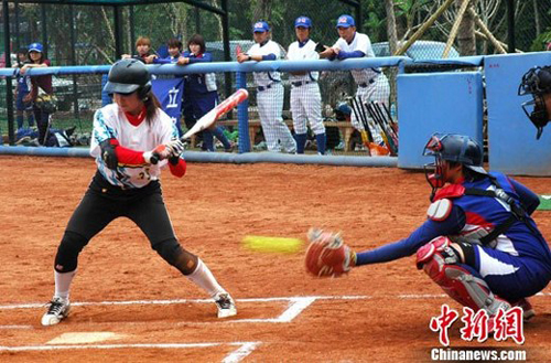 4月2日下午,“2011楠景新城杯·海峽兩岸女子壘球賽”在云南西雙版納楠景新城棒壘球訓練基地舉行。圖為臺北體育學院隊與廣東女壘進行比賽。 中新社發 楊穎融 攝