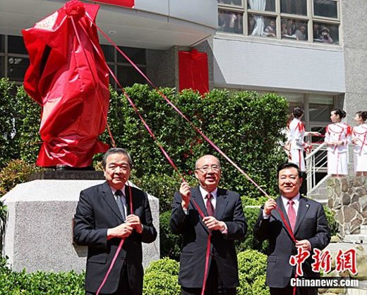 安徽省長王三運20日率安徽省經貿文化參訪團來到臺灣銘傳大學桃園校區,向該校贈送一尊劉銘傳銅像。圖為王三運(右)與中國國民黨榮譽主席吳伯雄(中)、銘傳大學校長李銓(左)共同為銅像揭幕。中新社發 路梅 攝
