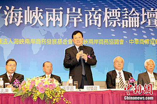 5月10日,國家工商行政管理總局副局長付雙建(中)率中華商標協會代表團,參加在臺北舉行的2011海峽兩岸商標論壇。付雙建表示,兩岸商標保護與發展形勢漸入佳境。中新社發 路梅 攝