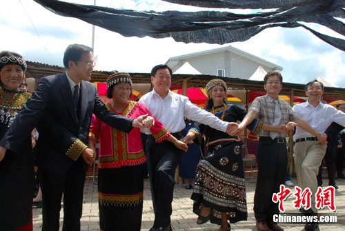 5月22日,四川省長蔣巨峰一行探訪臺灣高雄杉林鄉(xiāng)大愛園區(qū),向當(dāng)?shù)赜懡虨?zāi)后重建經(jīng)驗(yàn),并與受“8·8”風(fēng)災(zāi)影響遷移到園區(qū)的民眾手拉手跳舞。中新社發(fā) 劉賢 攝