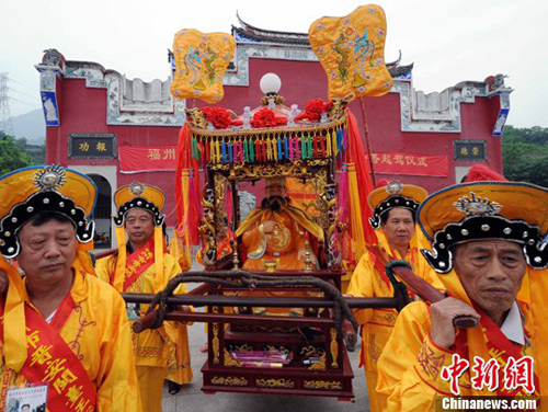 6月1日,應澎湖縣縣長王乾發(fā)、澎湖縣王氏宗親理事會盛邀,福州市晉安閩臺王審知研究會訪問團一行76人,在福州蓮花山閩王紀念館舉行隆重起駕儀式,護駕閩王金身赴澎湖會香進行為期7天的交流訪問。中新社發(fā) 劉可耕 攝