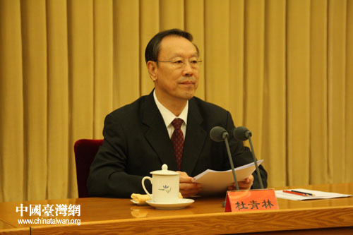 全國政協副主席、中共中央統戰部部長、中國和平統一促進會執行副會長杜青林在會議上做了題為《深化和平發展 著力爭取民心 促進祖國統一》的工作報告。(中國臺灣網 王君飛 攝)