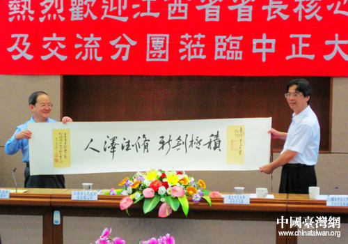 中國(guó)臺(tái)灣網(wǎng)8月24日嘉義消息 8月23日,江西省長(zhǎng)鹿心社一行參訪臺(tái)灣中正大學(xué),并向臺(tái)灣中正大學(xué)贈(zèng)送加蓋原“中正大學(xué)關(guān)防”的臺(tái)灣中正大學(xué)校訓(xùn)書(shū)法條幅、原“中正大學(xué)”藏書(shū)影印本、兩校友好交往畫(huà)冊(cè)。中正大學(xué)校長(zhǎng)吳志揚(yáng)向鹿心社贈(zèng)送“百年樹(shù)人碑”及中正大學(xué)出版品。