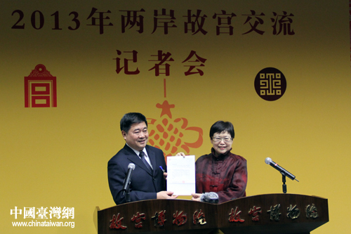 兩岸故宮博物院院長(zhǎng)22日在北京故宮探討合作,在隨后舉行的2013年兩岸故宮交流記者會(huì)上,臺(tái)北故宮博物院院長(zhǎng)馮明珠(右)遞給北京故宮博物院院長(zhǎng)單霽翔(左)一封邀請(qǐng)函,邀其年內(nèi)訪臺(tái)。(中國(guó)臺(tái)灣網(wǎng) 楊麗 攝)