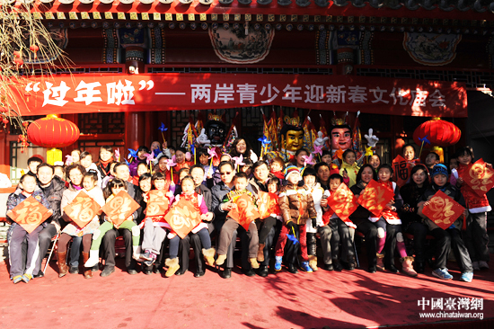兩岸青少年迎新春文化廟會在一片喜氣洋洋的迎新春接福字的喜慶氣氛中展開。來自京臺兩地的200余名青少年相聚在老北京四合院里,包餃子、套圈、剪窗花,學(xué)習(xí)品味“年”文化。他們不僅體驗(yàn)了中國傳統(tǒng)過年的習(xí)俗,還感受了臺灣本土特有手偶劇、電音三太子等民俗文化。
