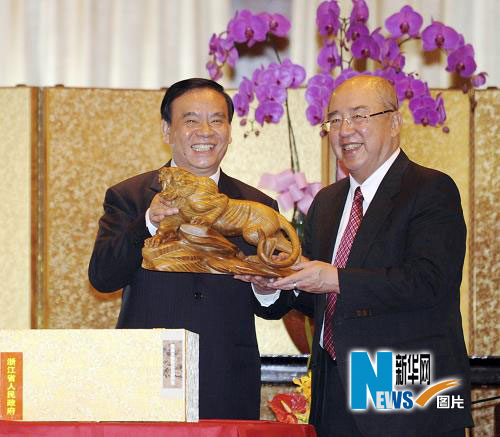 6月9日,中國國民黨榮譽主席吳伯雄(右)在臺北圓山大飯店與浙江省省長呂祖善互贈禮物。當日,浙江省長呂祖善率領的千人代表團抵達臺北,開始進行為期一周的訪問。圖片來源:新華網