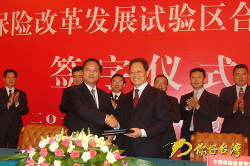 中國保監會主席吳定富(右)與廈門市市長劉賜貴(左)簽字后握手。(你好臺灣網 周步恒攝)
