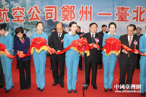 長榮公司鄭州—臺北舉行首航儀式。圖為參加首航儀式的嘉賓為首航成功剪彩。圖片來源:河南省臺辦