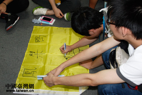“2013年海峽兩岸紅十字青少年夏令營(yíng)”營(yíng)員們按大陸、臺(tái)灣學(xué)生各一半分成四個(gè)小組,分別取名為“鳳梨鴨”、“V2隊(duì)”、“心海連”和“心綠隊(duì)”。“鳳梨鴨”隊(duì)員們繪制隊(duì)旗。(中國(guó)臺(tái)灣網(wǎng) 郜利敏 攝)