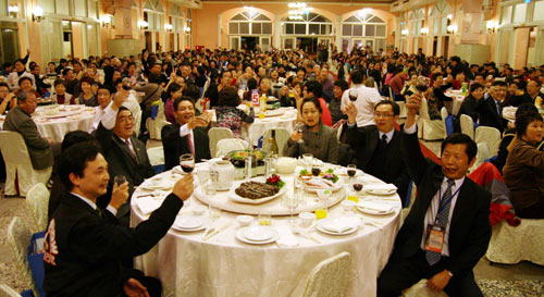由國旅集團組成的千人陸客團,29日抵達苗栗縣進行晚宴,團員一同舉杯,準備迎接在臺的倒數跨年夜。
