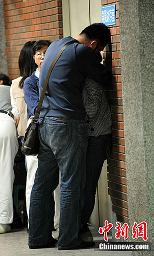 首批阿里山小火車意外死者家屬,29日早上到殯儀館認尸。當家屬看見死者遺體后,均在門外悲傷抱頭痛哭。中新社發 譚達明 攝