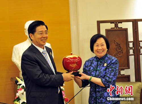 會見結束后,辜嚴倬云與郭聲琨互贈禮物。蔣雪林 攝