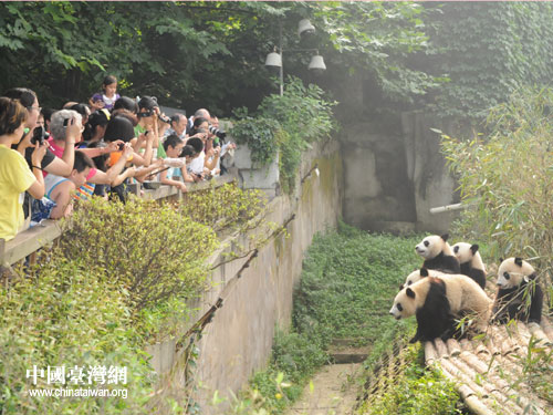 中國臺灣網7月30日成都消息 7月29日上午,成都大熊貓繁育基地迎來了一批特殊的游客,他們是受中共四川省委書記劉奇葆邀請到四川參加夏令營的臺灣學生交流團,他們在這里與可愛的大熊貓進行了一番親密接觸。
