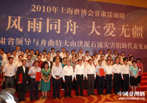 中國臺(tái)灣網(wǎng)9月15日舟曲消息 日前,在上海世博會(huì)甘肅活動(dòng)周開幕式上,16家臺(tái)資企業(yè)和全國臺(tái)企聯(lián)發(fā)揚(yáng)大愛無疆、愛心無限的精神,慷慨解囊,為甘肅舟曲捐款1780萬元、捐物150萬元。甘肅省省委書記陸浩、代省長劉偉平等領(lǐng)導(dǎo)會(huì)見了捐款企業(yè)代表并頒發(fā)捐款證書。