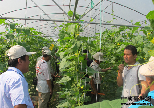 考察團一行在東興鎮松柏村參觀大棚蔬菜基地,松柏村菜農在向臺灣客人講解。(圖片來源:防城港市臺辦)