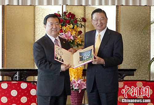 安徽省長王三運(yùn)率領(lǐng)的“安徽經(jīng)貿(mào)文化寶島行”參訪團(tuán),4月18日午間抵達(dá)臺(tái)北,將展開為期8天的交流活動(dòng)。圖為王三運(yùn)(左)抵臺(tái)后,在臺(tái)北圓山飯店會(huì)見臺(tái)灣海基會(huì)董事長江丙坤。中新社發(fā) 路梅 攝