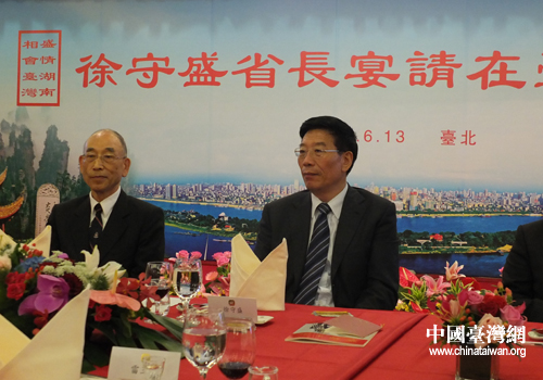 中國臺灣網6月14日臺北消息 6月13日晚,湖南省省長徐守盛在臺北圓山飯店宴請湖南在臺鄉親,臺灣中華湖湘文化發展協會理事長張京育、臺灣湖南商會會長熊子杰、臺灣12個湖南同鄉會、30個臺北各縣市同鄉會的鄉親代表共124人參加了宴請。