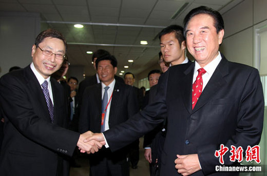 2月28日上午,海協會會長陳云林一行圓滿結束6天的首次經貿之旅,搭乘中華航空公司班機離臺。圖為登機前,陳云林與前往桃園機場送行的;鶗倍麻L高孔廉握手道別。中新社發 董會峰 攝