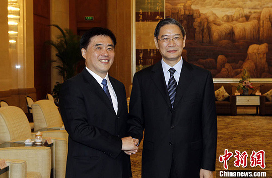 7月2日,中共中央臺辦、國務院臺辦主任張志軍(右)在上海會見臺北市市長郝龍斌一行。湯彥俊 攝