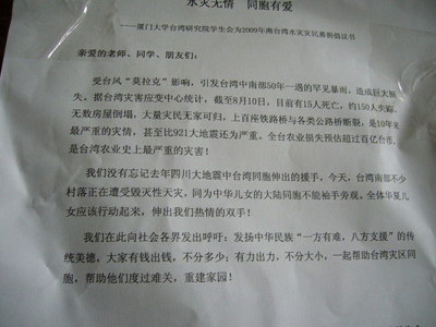 據臺媒“今日新聞網”報道,11日中午,廈門大學臺灣研究院、校園三家村等地展開募款活動,號召廈大師生有錢出錢、有物出物,義助臺灣災民。臺研院學生會在倡議書中指出:“我們沒有忘記去年四川大地震中臺灣同胞伸出的援手。今天,臺灣南部不少村落正在遭受毀滅性天災,同為中華兒女的大陸同胞不能袖手旁觀。全體華夏兒女應該行動起來,伸出我們熱情的雙手。”