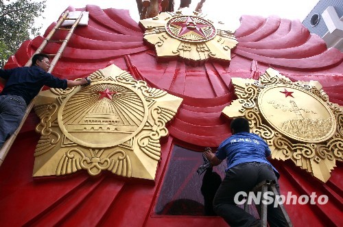 9月24日,兩名工作人員正在對“寶島臺灣彩車”仔細地粉刷。該彩車將參加首都國慶60周年群眾游行。中新社發 張宇 攝