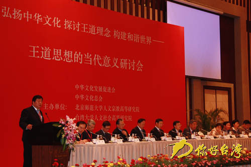 4月22日上午,“弘揚中華文化探討王道理念構(gòu)建和諧世界——王道思想的當代意義研討會”在江蘇省南京市開幕,海峽兩岸及香港地區(qū)專家學者和企業(yè)界、科技界等有影響的嘉賓100余人,就兩岸如何合作弘揚中華傳統(tǒng)文化、王道思想的當代意義、王道思想對構(gòu)建和諧世界的啟示等進行研討。中共江蘇省委副書記朱善璐,中臺辦、國臺辦副主任孫亞夫,中華文化發(fā)展文化促進會副會長辛旗先后在開幕式上致辭。前全國人大常委會副委員長、中華文化發(fā)展促進會會長許嘉璐和臺灣中華文化總會會長劉兆玄出席開幕式并致辭和專題演講。