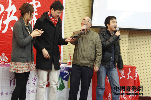 北京臺聯榮譽主席盧咸池和北京大學臺灣研究會小組的選手共同演唱《外婆的澎湖灣》。(中國臺灣網 郜利敏 攝)