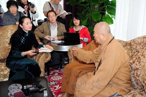 星云大師(右)接受記者采訪。