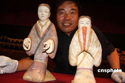 圖為陜西漢陽(yáng)陵考古陳列館副館長(zhǎng)王保平在展示造型精美的跽坐狀侍女俑和拱手女傭。中新社發(fā) 董會(huì)峰 攝