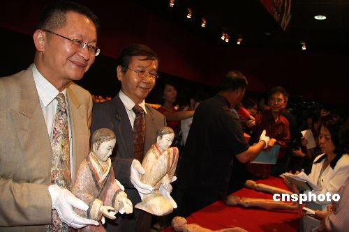 圖為臺(tái)灣金傳媒集團(tuán)執(zhí)行長(zhǎng)楊仁烽(左一)、臺(tái)北歷史博物館館長(zhǎng)黃永川(左二)面帶微笑,向記者展示彩繪女陶俑。中新社發(fā) 董會(huì)峰 攝