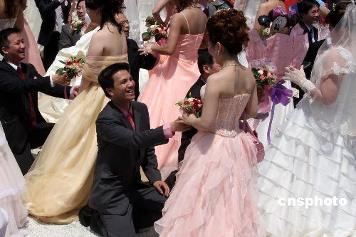 6月28日,50對新人頂著烈日,參加在臺北縣板橋市435藝文中心舉行的露天集體婚禮,現場安排乘坐越野車入場、求婚、擁吻等環節,場面溫馨而又火爆。圖為眾新郎右膝著地,向新娘獻花、求婚。中新社發 董會峰 攝