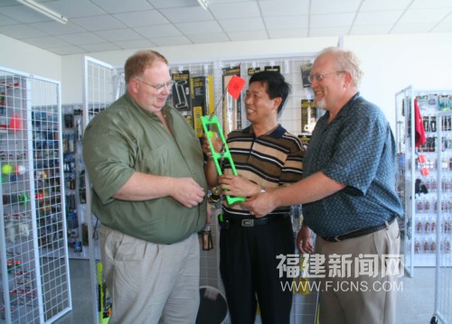 8月3日,美國威斯康新洲2名客商專程來到福建東山的臺資企業元煌集團參觀新開發的漁具、釣具樣品,簽下一筆大額訂單。由臺商呂榜洲先生創辦的元煌集團,積極應對國際金融危機,今年來開發歐美新興的冰上釣具、漁具等6個系列產品,暢銷國際市場。(謝漢杰 攝)