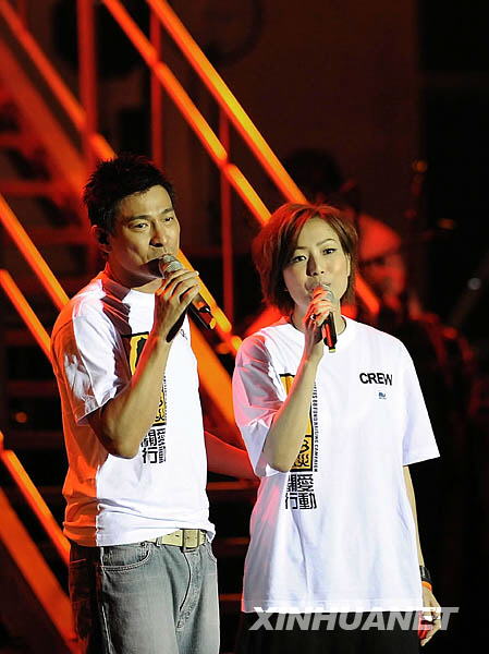 8月17日,在香港舉行的賑災義演中,香港藝人劉德華(左)與鄭秀文演唱《喝彩》。新華社記者陳鐸攝