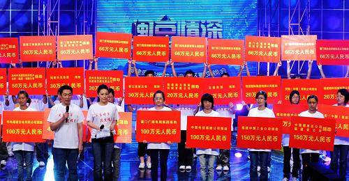 8月19日,社會各界在賑災晚會上紛紛捐款獻愛心。當日,福建省舉行福建同胞援助臺灣災區賑災晚會,幫助在臺風“莫拉克”中受災的臺灣同胞渡過難關。福建省紅十字會當晚接受社會各界捐助人民幣8681萬多元。新華社記者 張國俊 攝