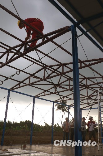 8月25日,大陸技術人員在臺灣災區展開援建工作。大陸捐贈臺灣災區前三批約六百套活動板房已送抵高雄縣、屏東縣多處受災民眾安置地,搭建工程將于近期展開。
