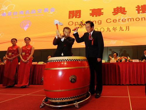 9月17日,海協會會長陳云林(前右)與臺北世貿中心董事長王志剛(前左)共同擂鼓為交易會揭幕。當日,由南京市政府與臺北世貿中心聯合舉辦的“2009南京臺灣名品交易會”在南京國際博覽中心開幕。展會參展企業達到750家,其中臺灣本土企業占73%,大陸臺企占27%,是歷年來臺商企業產品在大陸最大規模的集中亮相。 新華社記者 姜帆 攝