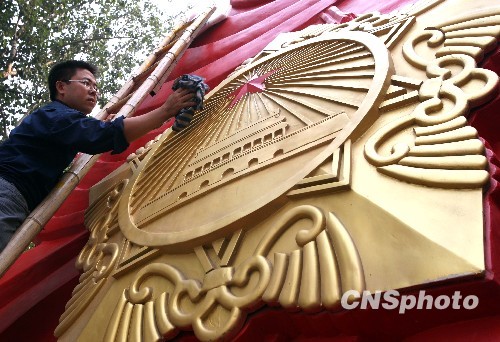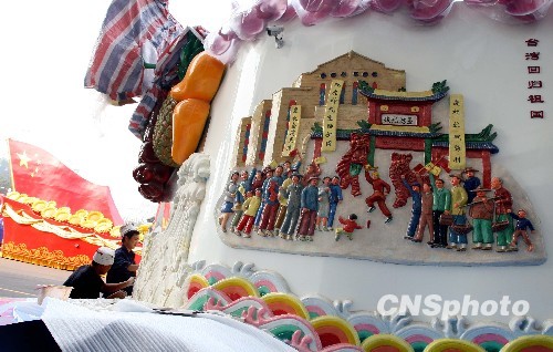9月24日,兩名工作人員正在對“寶島臺灣彩車”仔細地粉刷。該彩車將參加首都國慶60周年群眾游行。中新社發 張宇 攝