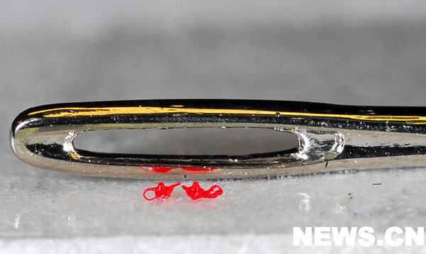 用寶石灰塵雕刻出的長0.5mm、寬0.3mm、高0.4mm的兩只微雕茶壺與普通縫衣針放置在一起(10月16日攝)。