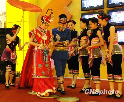 圖為畬族寶塔茶文化婚俗慶典在海峽兩岸茶博會坦洋功夫館上熱鬧上演。中新社發 王東明 攝