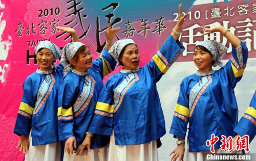 10月12日,2010年臺北客家義民嘉年華在臺北舉行發布會。圖為穿著客家傳統服裝前來參加發布會的島內客家鄉親,現場為嘉年華活動造勢。 中新社發 王健 攝