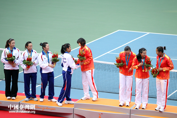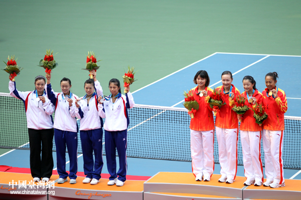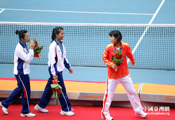 中國臺灣網11月16日廣州消息 第十六屆廣州亞運會女子網球團體賽決賽,雖然中華臺北隊不敵中國隊,獲得銀牌,但在頒獎儀式上,兩岸女網金花們卻十分輕松,交流不斷。(記者 鐘寶華)